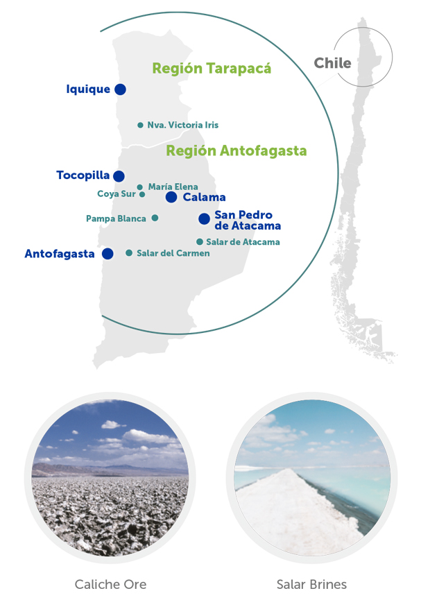 Annually, SQM produces around 1,5 million MT of nitrates salts from caliche ore and salar brines, two natural resources found in northern Chile. Caliche is mined from surface deposits in the Atacama Desert; derived products include sodium nitrate and iodine. The salar brines are pumped from the underground in the Salar de Atacama (Atacama Salt Flat) after which they are transferred to large solar evaporation ponds to physically separate the desired elements. The main derived products are: lithium chloride, potassium chloride, magnesium chloride, boric acid and potassium sulphate. Nitrates are produced after the caliche mineral is crushed and exposed to a leaching process with water. Sodium nitrate is obtained from this leached solution by crystallization. Part of the obtained sodium nitrate goes through another stage of processing during which it reacts with potassium chloride from the Salar de Atacama. The mixture is then subject to other processes such as crystallization, refining and drying to yield potassium nitrate.